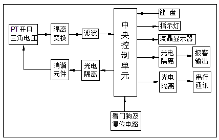 裝置實時監(jiān)測PT開口三角電壓,將采集到的電壓經(jīng)信號調(diào)理電路、AD轉(zhuǎn)換電路輸入到CPU,由CPU計算零序電壓四種頻率的電壓分量,若有故障發(fā)生則判斷故障類型,并顯示、保存故障信息,同時給出告警信號。如果是鐵磁諧振則按設定程序瞬間啟動消諧元件予以消除。